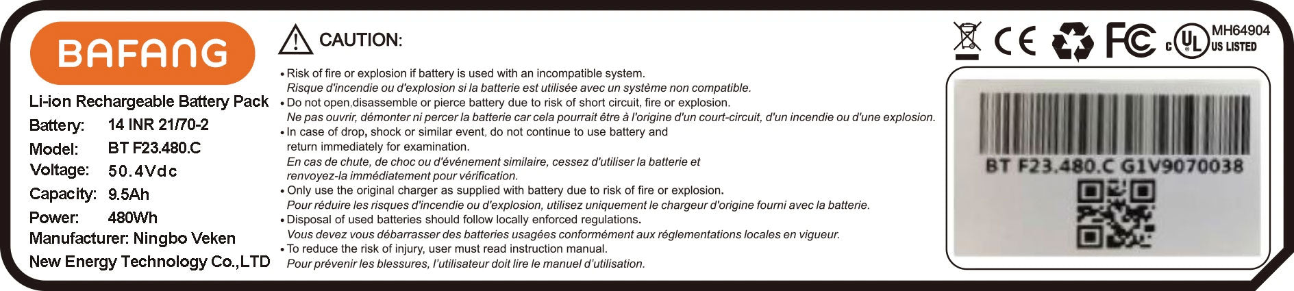 Note: The BT F23.480.C battery is only compatible with the M225/M325 drive systems with CAN protocol. Bafang M225/M325/M625 drive systems can only be used on vehicles intended for off-road use and designed to travel on unpaved surfaces. Please make sure to comply with local laws and regulations.