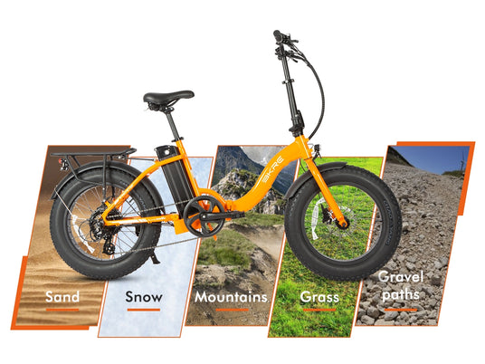 Whether it's traversing sandy beaches, snowy trails, mountain paths, cruising through parks, heading to the office, or riding on straight roads, the eBike equipped with 20*4.0 fat tires easily meets the challenge.