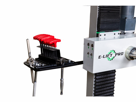 The E-Lift PRO Single-Sided Repair Stand Assembly provides a solid foundation for bike repairs with its 600mm*800mm basing and integrated tool box, ensuring your tools are organized and accessible. Its single-sided design allows for efficient, easy access to one side of your bike, making it perfect for all repair tasks. Designed for ebikes, emotos bikes, and dirt bikes, this stand ensures a stable and secure platform, even during heavy-duty repairs.